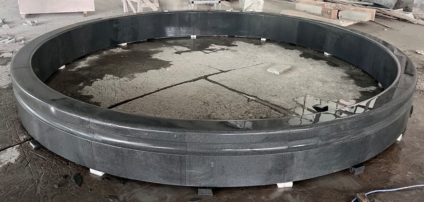 12′ OD round cypress fountain surround with 6″ wall thickness, 14″ height w/o seat cap, carved of Charcoal Grey Granite